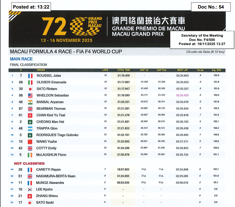 JULES ROUSSEL WINS FORMULA 4 WORLD CUP AT MACAU AGAINST ALL THE ODDS