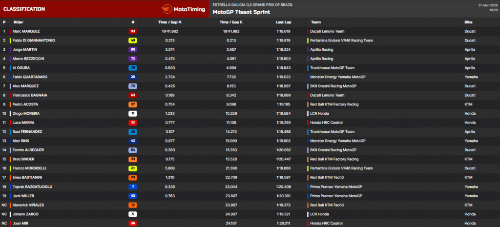 In the end, Márquez crossed the finish line in first place, securing a strong Sprint victory. Di Giannantonio finished second after leading for much of the race, while MartÃn completed the podium in third, marking his return to the top three in a Sprint race after a long time.