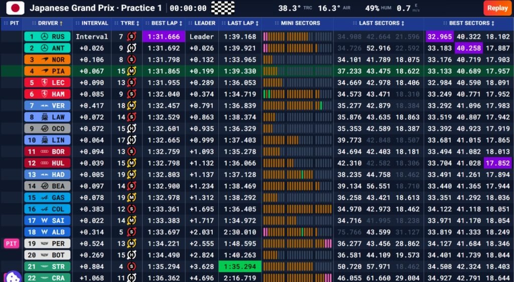 The early laps were mainly used to understand how the new generation of cars behaves at Suzuka, especially in terms of energy management, which is a key factor this season. Charles Leclerc set the early pace with a lap of 1:32.260, followed very closely by George Russell, Andrea Kimi Antonelli, and Piastri. Ferrari also chose not to use its updated front wing during this session.