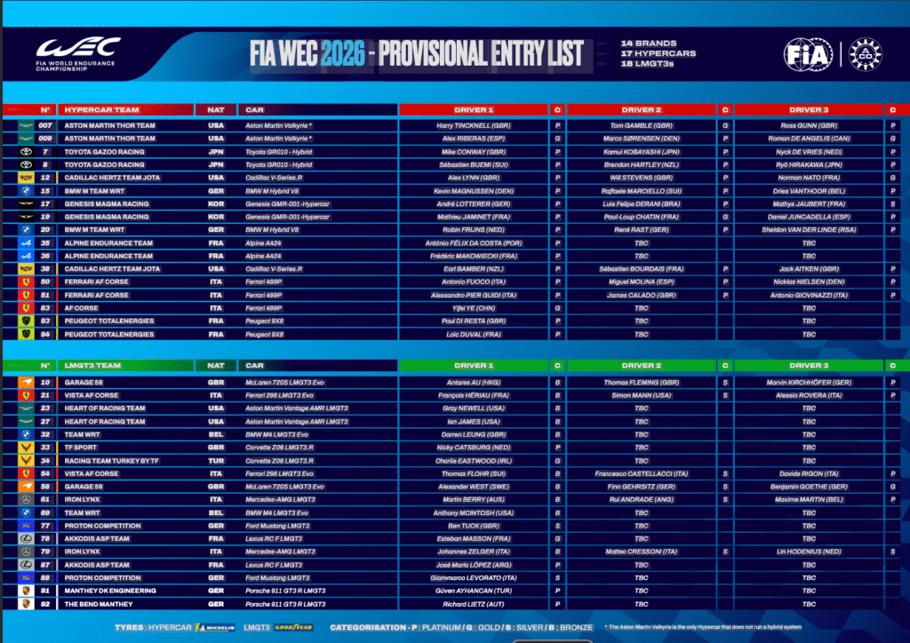 Together, the 17 Hypercars and 18 LMGT3 entries form a 35‑car field that blends heavyweight factory efforts with ambitious private and customer teams. The depth of manufacturers and the quality of driver line‑ups across both classes suggest that the 2026 WEC season will be one of the most competitive and story‑rich campaigns yet.