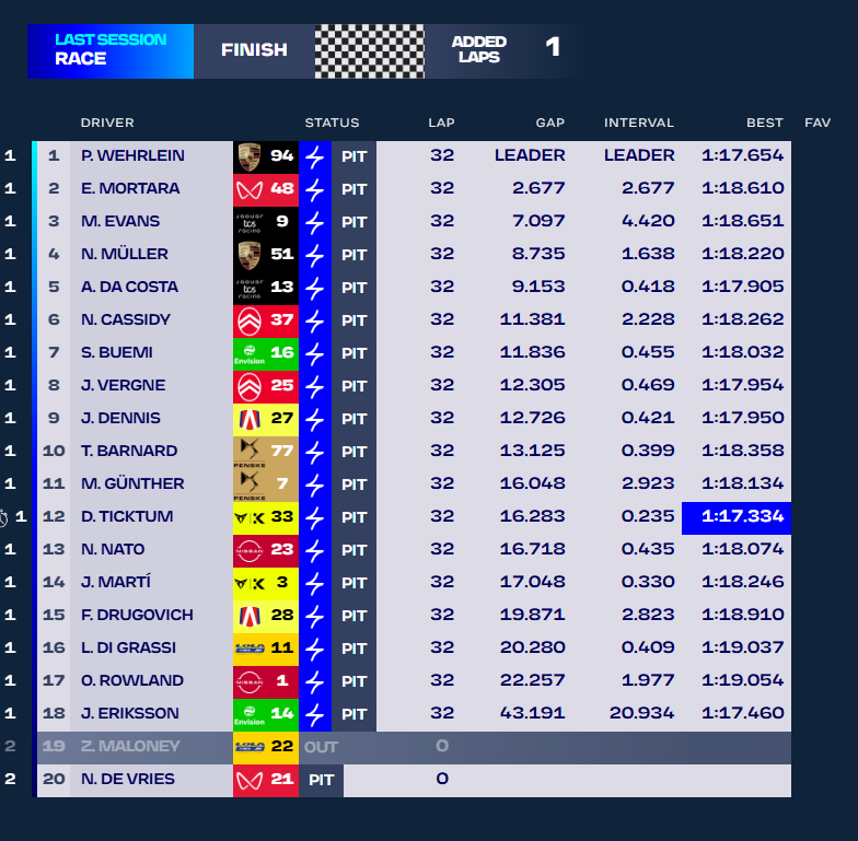 By lap 23 of 31, the race was almost decided. Wehrlein had opened an eight-second gap to second place, a big advantage in Formula E.